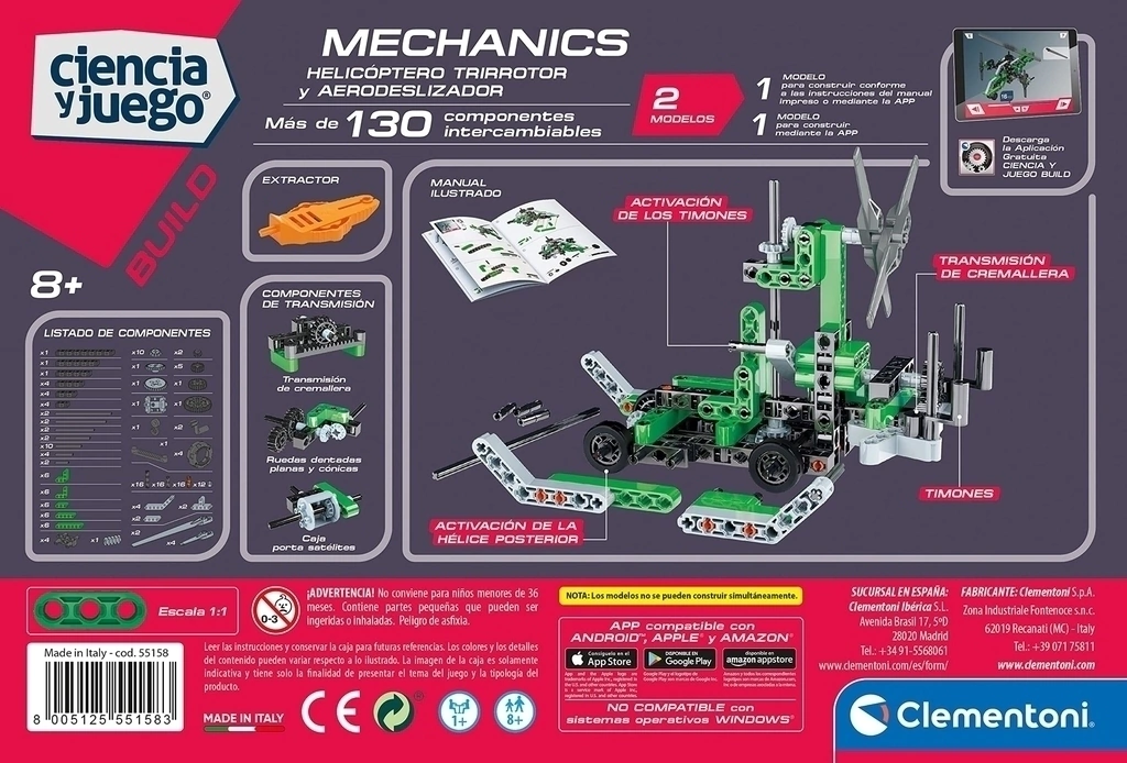 Un kit científico para explorar la mecánica y la ingeniería; gracias a 50 modelos y aplicaciones técnicas de dificultad progresiva. Un laboratorio con todos los instrumentos para descubrir cómo construir distintos modelos y hacerlos funcionar.