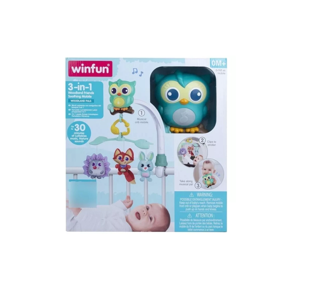 - Móvil musical para cuna con hasta 30 minutos de relajantes canciones de cuna y 3 adorables amiguitos del bosque de tela.